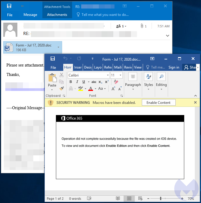 Victims are lured to open the attached document and enable the macro to kick-start the infection process.
